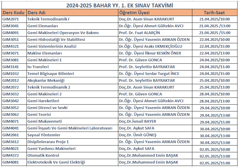 2024-2025 BAHAR YY. 1. EK SINAV TAKVİMİ